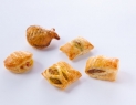 Description | Deep frozen mini puff pastry, filled with turkey and curry, ham and cheese, salmon, minced meat, ricotta-spinach filling (45%), decorated with free-range eggwash (3%), ready to bake |
